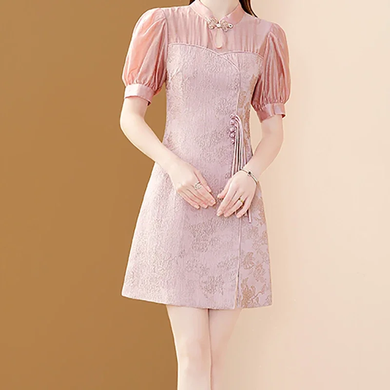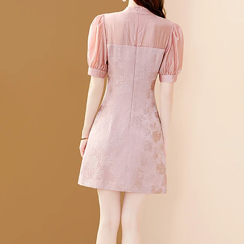 The Women Pink Floral Embroidery Dress is a versatile and elegant choice for summer wardrobes. Designed with puff sleeves and a half-high collar, this A-line pink floral dress exudes sophistication while providing a flattering, slim fit. The embroidery floral design adds a touch of delicate detail, making this dress perfect for a variety of occasions, from office meetings to casual outings. The natural waistline and knee-length make it an ideal option for those seeking both elegance and comfort in their attire.